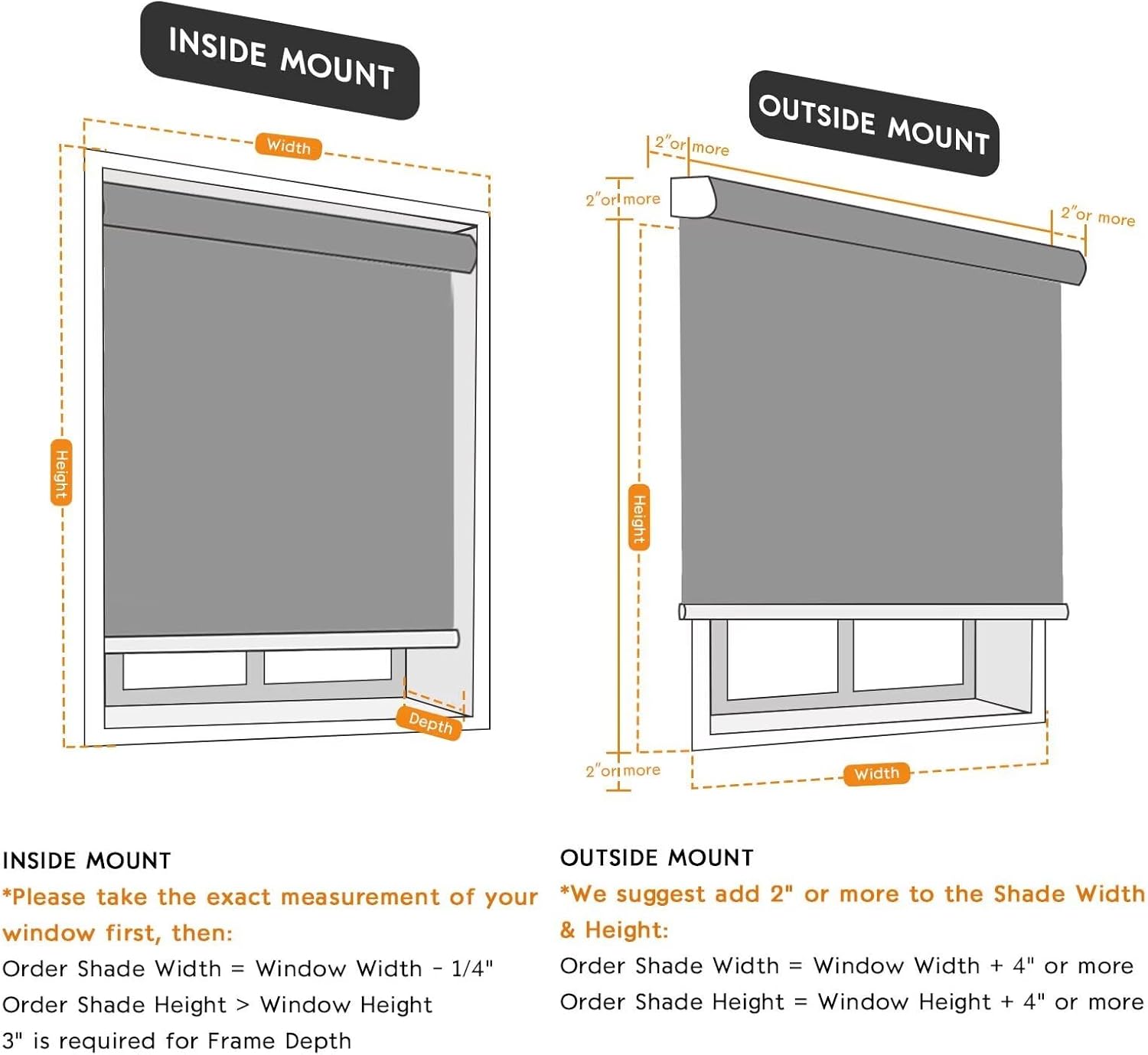 - How to Choose Perfect Shades: Shade width is the valance width. For inside mount, window frame should have at least 3″ depth, and shade width should be smaller than window width. Fabric width will be 0.5″ narrower than the shade width to cause a tiny light gap on each side. If you not accept the light gap, please select outside mount and shade width 4″ to 6″ wider than window frame, shade length at least 4″ longer than the window length for better coverage.
